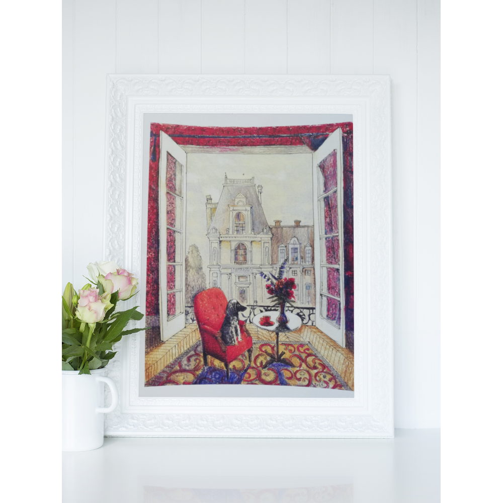 ”Cățel cu fotoliu roșu” de Olga Grebennik / Art Print