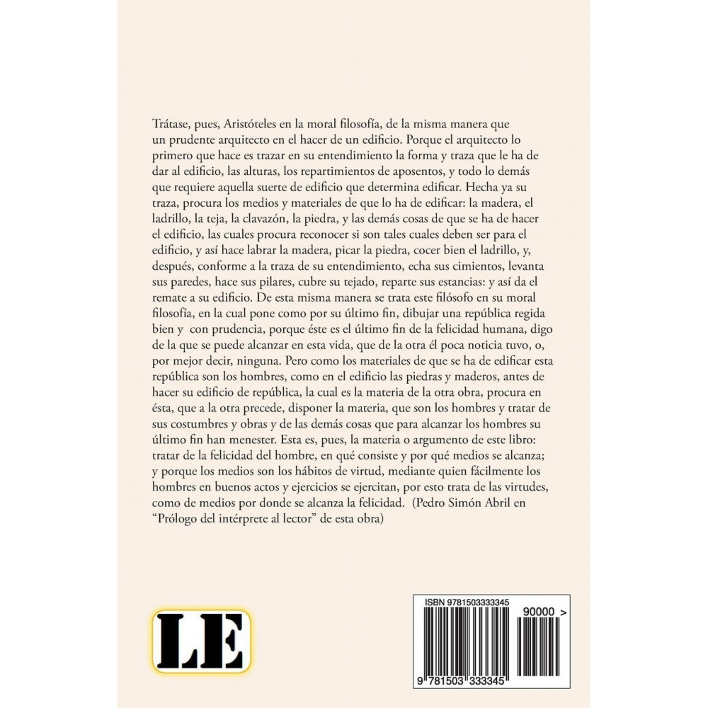 Trátase, pues, AristĂłteles en la moral filosofĂa, de la misma manera que un prudente arquitecto en el hacer de un edificio. Porque el arquitecto lo primero que hace es trazar en su entendimiento la forma y traza que le ha de dar al edificio, las alturas, los repartimientos de aposentos, y todo lo demás que requiere aquella suerte de edificio que determina edificar. Hecha ya su traza, procura los medios y materiales de que lo ha de edificar: la madera, el ladrillo, la teja, la clavazĂłn, la piedra, y las demás cosas de que se ha de hacer el edificio, las cuales procura reconocer si son tales cuales deben ser para el edificio, y asĂ hace labrar la madera, picar la piedra, cocer bien el ladrillo, y, despuĂ©s, conforme a la traza de su entendimiento, echa sus cimientos, levanta sus paredes, hace sus pilares, cubre su tejado, reparte sus estancias: y asĂ da el remate a su edificio. De esta misma manera se trata este filĂłsofo en su moral filosofĂa, en la cual pone como por su Ăşltimo fin, dibujar una repĂşblica regida bien y con prudencia, porque Ă©ste es el Ăşltimo fin de la felicidad humana, digo de la que se puede alcanzar en esta vida, que de la otra Ă©l poca noticia tuvo, o, por mejor decir, ninguna. Pero como los materiales de que se ha de edificar esta repĂşblica son los hombres, como en el edificio las piedras y maderos, antes de hacer su edificio de repĂşblica, la cual es la materia de la otra obra, procura en Ă©sta, que a la otra precede, disponer la materia, que son los hombres y tratar de sus costumbres y obras y de las demás cosas que para alcanzar los hombres su Ăşltimo fin han menester. Esta es, pues, la materia o argumento de este libro: tratar de la felicidad del hombre, en quĂ© consiste y por quĂ© medios se alcanza; y porque los medios son los hábitos de virtud, mediante quien fácilmente los hombres en buenos actos y ejercicios se ejercitan, por esto trata de las virtudes, como de medios por donde se alcanza la felicidad. (Pedro SimĂłn Abril, “PrĂłlogo. Del intĂ©rprete al lector”)