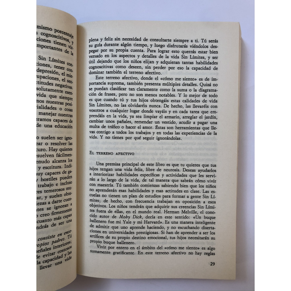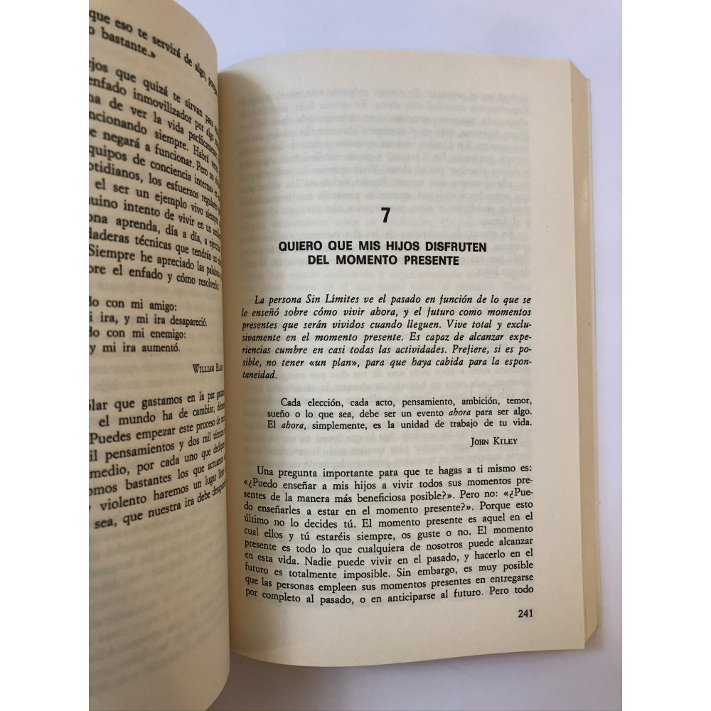 Si tienes hijos o, sencillamente, algún niño está a tu cargo, con toda seguridad te habrás planteado esta pregunta: ¿Qué deseamos realmente para ellos?. El doctor Dyer, padre de cinco hijos cuyas edades oscilan entre la de Universitario y la primera infancia, formuló esta cuestión a varios miles de padres, abuelos y educadores... incluido el mismo. Pero las respuestas dieron un resultado realmente insólito: a los adultos no les interesaba en exceso que sus hijos atesoraran riquezas, triunfaran en una determinada profesión o fueran admitidos en una universidad de élite; les preocupaba más bien todo lo relacionado con su bienestar y su felicidad. Wayne Dyer ha escrito este libro con la convicción de que los padres pueden, podemos, desde hoy mismo, educar a unos hijos Sin Límites, que ""funcionen"" plenamente; unos hijos que sean creativos, que se sientan útiles, que disfruten de la vida y que estén motivados a ""crecer"" en todos los sentidos. Además, el doctor Dyer nos ofrece técnicas, ideas y estrategias para que podamos convertir la condición de padres en una gloriosa experiencia y para que gocemos en cada etapa del recorrido por la senda de la paternidad. He aquí una obra de lectura imprescindible para todos los padres verdaderamente responsables. Prepáreles para su futuro.