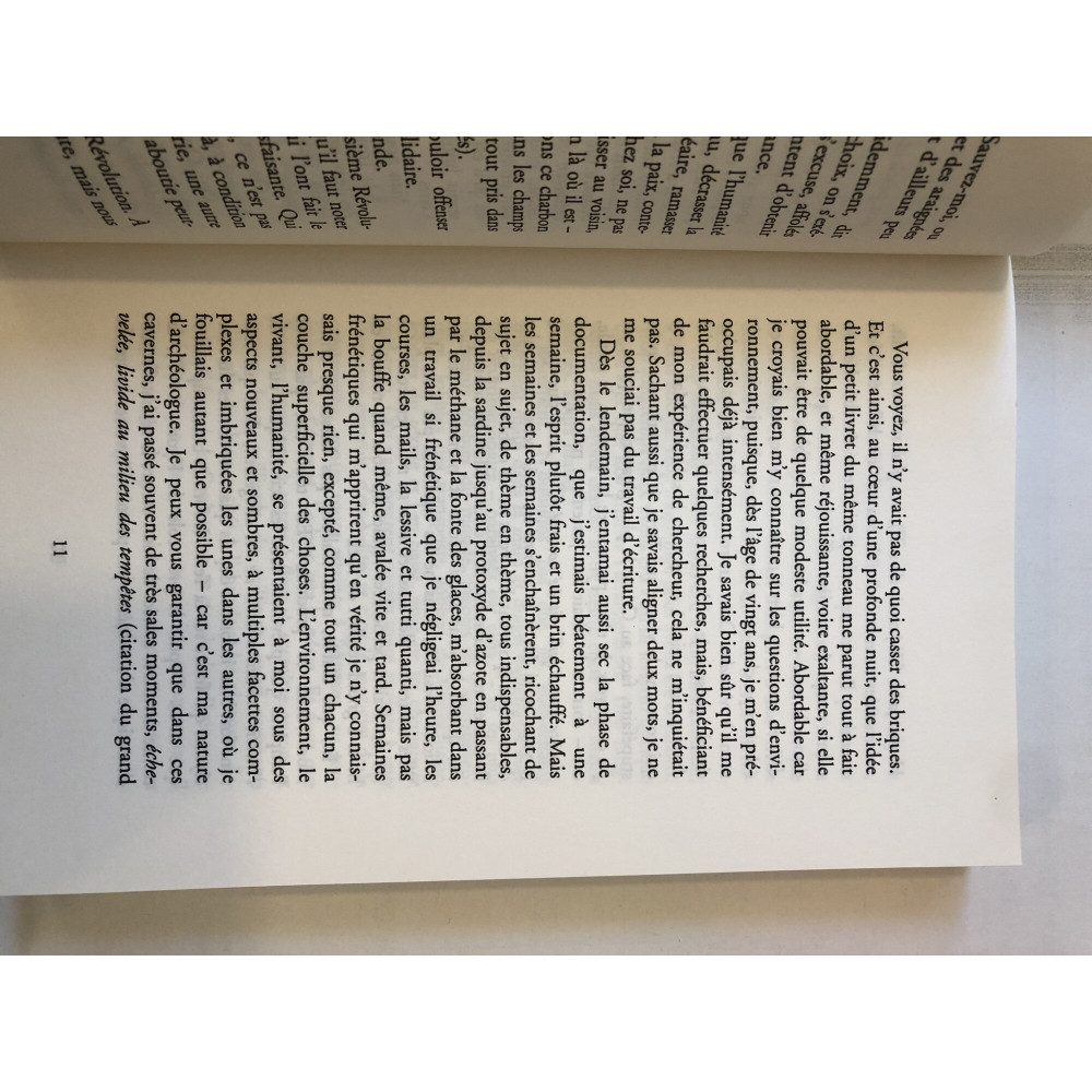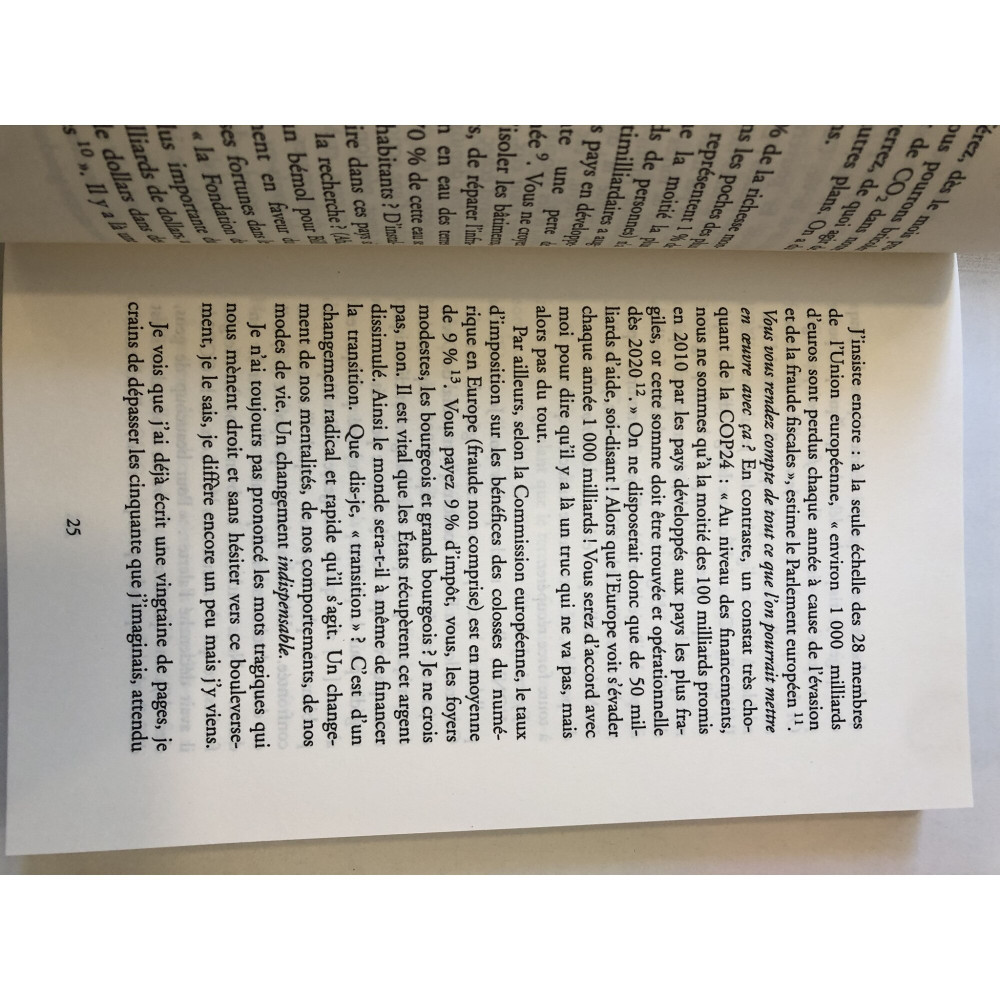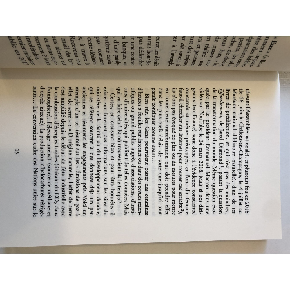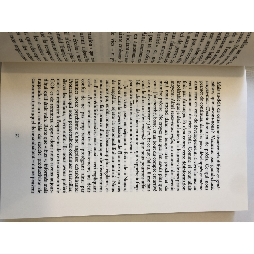 Mais bon sang, comment vais-je m'en sortir de cette tache insensée ? De cette idée de m'entretenir avec vous de l'avenir du monde vivant ? Alors que je sais très bien que vous auriez préféré que je vous livre un roman policier. Il y a dix ans, j'avais publié un très court texte sur l'écologie. Et quand on m'a prévenue qu'il serait lu à l'inauguration de la COP 24, c'est alors que j'ai conçu un projet de la même eau, un peu plus long, sur l'avec de la Terre, du monde vivant, de l'Humanité. Rien que ça.»