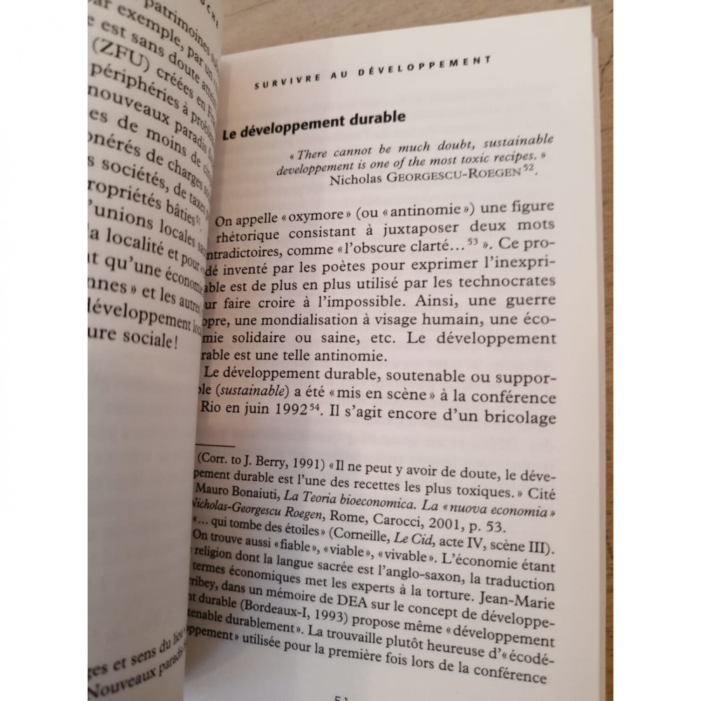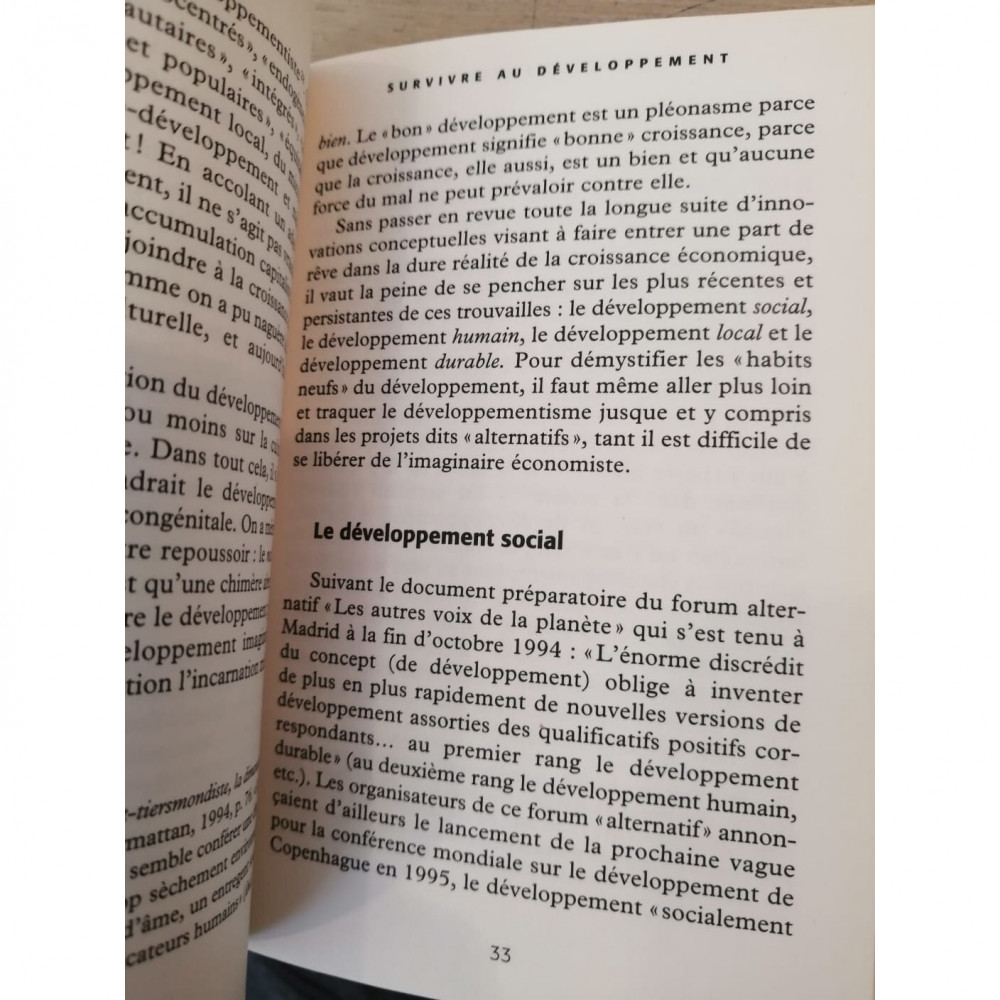 Social, humain, local, durable.... Le développement a récemment revêtu des « habits neufs » qui satisfont les critères des organisations internationales telles que la Banque mondiale et le Fonds monétaire international. Mais la logique économique est restée la même, et le modèle de développement conforme à l'orthodoxie néolibérale. Or le développementisme repose sur des croyances eschatologiques en une prospérité matérielle possible pour tous — que l'on sait dommageable et insoutenable pour la planète. Il faut donc remettre en cause les notions de croissance, de pauvreté, de besoins fondamentaux, et déconstruire notre imaginaire économique, ce qui affecte l'occidentalisation et la mondialisation. Certes, il ne s'agit pas de proposer un impossible retour en arrière, mais de penser les formes d'une alternative au développement : notamment la décroissance conviviale et le localisme.