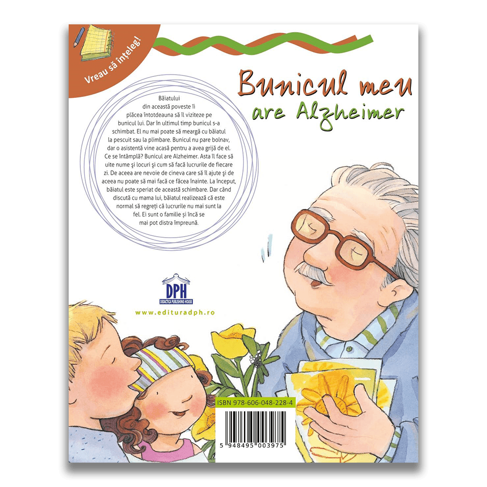 Atunci când o persoanÄ dragÄ are Alzheimer, trebuie sÄ Ă®nvÄČ›Äm cum sÄ gestionÄm sentimentele Č™i situaČ›iile. Cartea Bunicul meu are Alzheimer face parte din seria „Vreau sÄ Ă®nČ›eleg” Č™i Ă®i Ă®nvaČ›Ä pe copii cum sÄ se comporte cu o persoanÄ care suferÄ de aceastÄ boalÄ. Se adreseazÄ copiilor cu vârsta peste 4 ani. BÄiatului din aceastÄ poveste Ă®i plÄcea Ă®ntotdeauna sÄ Ă®l viziteze pe bunicul lui. Dar, Ă®n ultimul timp, bunicul s-a schimbat. El nu mai poate sÄ meargÄ cu bÄiatul la pescuit sau la plimbare. Bunicul nu pare bolnav, dar o asistentÄ vine acasÄ pentru a avea grijÄ de el. Ce se Ă®ntâmplÄ? Bunicul are Alzheimer. Asta Ă®l face sÄ uite nume Ĺźi locuri Ĺźi cum sÄ facÄ lucrurile de fiecare zi. De aceea are nevoie de cineva care sÄ Ă®l ajute Ĺźi de aceea nu poate sÄ mai facÄ ce fÄcea Ă®nainte. La Ă®nceput, bÄiatul este speriat de aceastÄ schimbare. Dar, când discutÄ cu mama lui, bÄiatul realizeazÄ cÄ este normal sÄ regreČ›i cÄ lucrurile nu mai sunt la fel. Ei sunt o familie Č™i Ă®ncÄ se mai pot distra Ă®mpreunÄ. Textul este simplu, iar ilustraČ›iile de pe fiecare paginÄ sunt atrÄgÄtoare. DouÄ pagini care prezintÄ activitÄČ›i pentru copii apar la finalul cÄrČ›ii, urmate de o secČ›iune de douÄ pagini pentru pÄrinČ›i, cu sfaturi despre explicarea subiectului mai detaliat. „Vreau sÄ Ă®nČ›eleg” este o serie de cÄrČ›i cu poveČ™ti cu imagini, scrise sensibil, care au Ă®n centru punctul de vedere al unui copil – Ă®n special punctul de vedere al acelor copii care au nevoie de Ă®ncurajare Ă®n faČ›a unor dificultÄČ›i emoČ›ionale sau fizice.