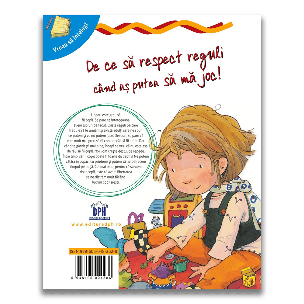Cartea De ce sÄ respect reguli când aČ™ putea sÄ mÄ joc! face parte din seria „Vreau sÄ Ă®nČ›eleg” Č™i le aratÄ copiilor cÄ, uneori, sÄ fii copil este dificil, dar copiii se pot distra fÄcând lucruri copilÄreČ™ti. Se adreseazÄ copiilor cu vârsta peste 4 ani. Copiii vor empatiza cu fetiČ›a din aceastÄ carte. Trebuie sÄ meargÄ la Č™coalÄ, sÄ facÄ temele Č™i sÄ mÄnânce legume care nu-i plac. I se pare cÄ adulČ›ii sunt norocoČ™i, pentru cÄ pot face ce doresc. AceastÄ poveste demonstreazÄ cÄ toatÄ lumea are obligaČ›ii de Ă®ndeplinit – Ă®n special adulČ›ii – Č™i de cele mai multe ori este mai distractiv sÄ fii copil. Scopul acestei cÄrĹŁi este acela de a face cunoscute, din perspectiva unui copil, câteva dintre realitÄĹŁile vieĹŁii acestuia. A fi copil poate fi uneori dificil, mai ales atunci când sunt atâtea lucruri care par nedrepte. Sunt reguli, consecinĹŁe Ĺźi adulĹŁi peste tot! Textul este simplu, iar ilustraČ›iile de pe fiecare paginÄ sunt atrÄgÄtoare. DouÄ pagini care prezintÄ activitÄČ›i pentru copii apar la finalul cÄrČ›ii, urmate de o secČ›iune de douÄ pagini pentru pÄrinČ›i, cu sfaturi despre explicarea subiectului mai detaliat. „Vreau sÄ Ă®nČ›eleg” este o serie de cÄrČ›i cu poveČ™ti cu imagini scrise sensibil care au Ă®n centru punctul de vedere al unui copil – Ă®n special punctul de vedere al acelor copii care au nevoie de Ă®ncurajare Ă®n faČ›a unor dificultÄČ›i emoČ›ionale sau fizice.