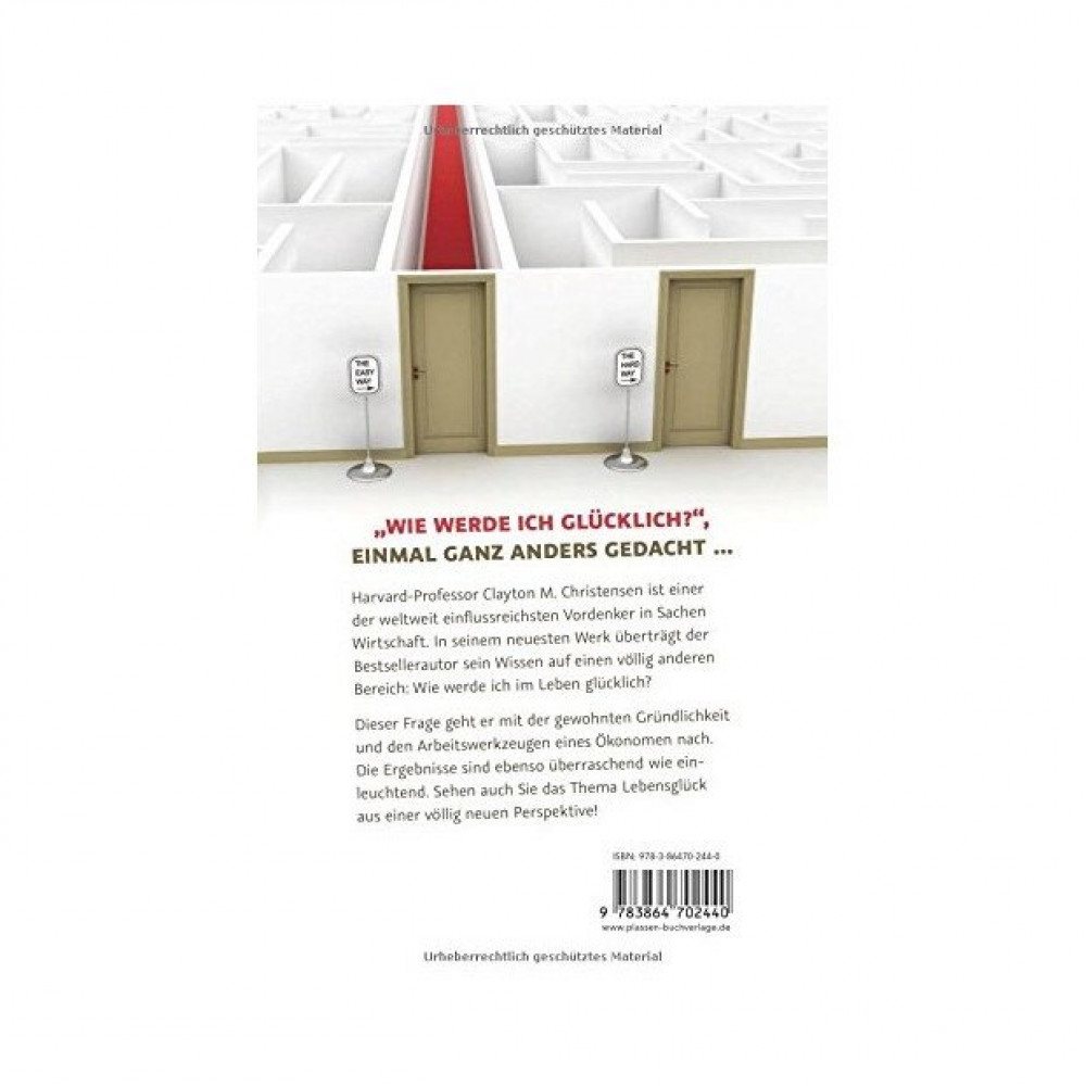 Seine Überlegungen führten Christensen zu den drei grundlegenden Fragen: Wie führe ich ein glückliches und sinnerfülltes Privatleben? Wie werde ich beruflich erfolgreich und habe Freude an meiner Arbeit? Und wie vermeide ich es, im Gefängnis zu landen? Er findet die Antworten in Wirtschaftstheorien, die er auf persönliche Lebensentscheidungen überträgt so zum Beispiel die Einführung einer Familienkultur, um den eigenen Kindern Leitlinien an die Hand zu geben. Dabei gibt er jedoch nicht rigide Verhaltensregeln vor, sondern liefert Denkanstöße, mit deren Hilfe der Leser zu seiner ganz persönlichen, maßgeschneiderten Strategie für ein erfülltes und erfolgreiches Leben gelangt.